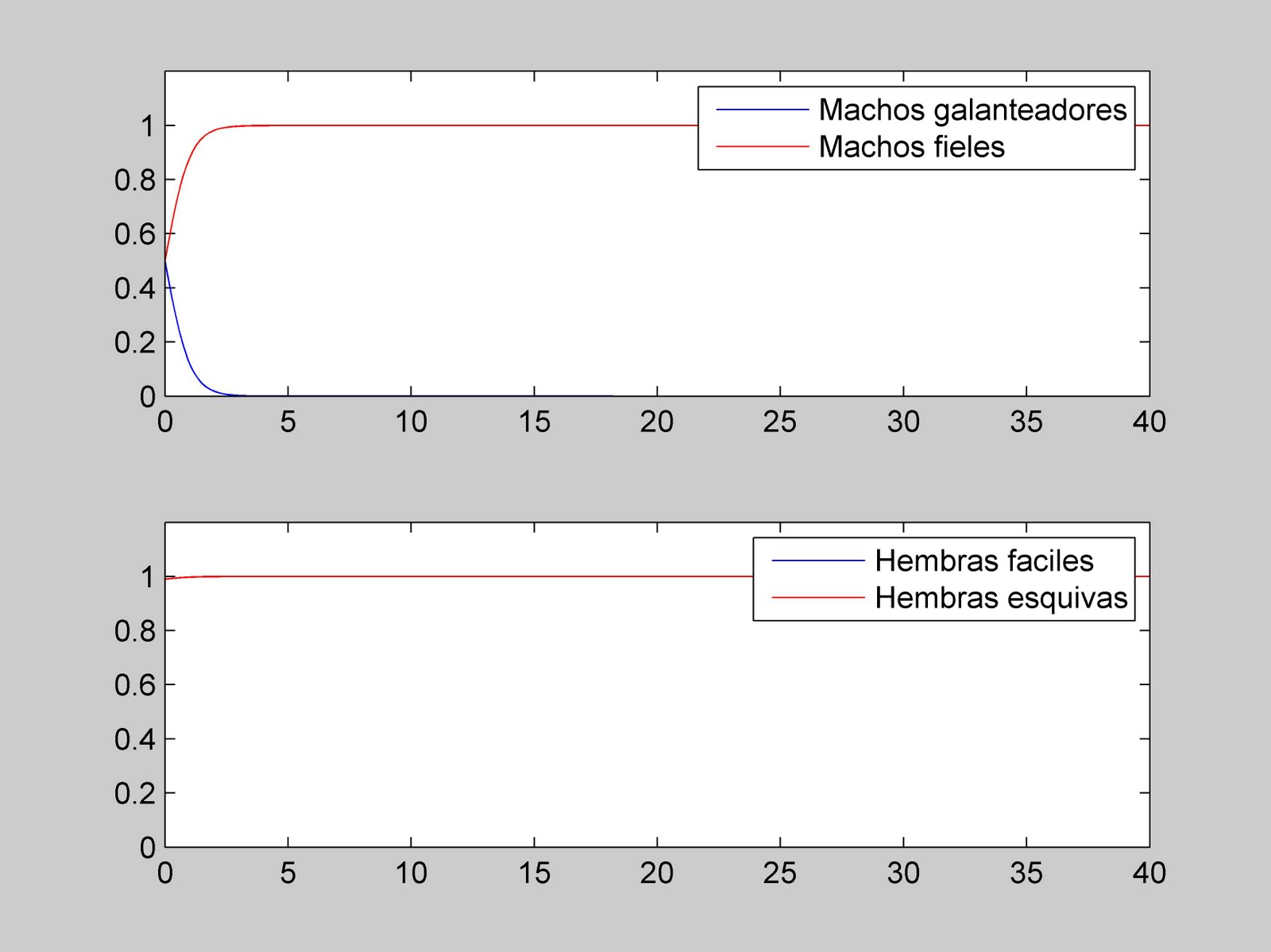 Primero, vemos un caso donde el 50% de los machos son don Juanes y el otro 50% son fieles, en un mundo donde el 100% de las hembras son esquivas: