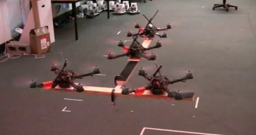 El laboratorio de robótica GRASP de la Universidad de Pennsylvania se dedica a la construcción de robots voladores del tipo llamado de quadrotor.