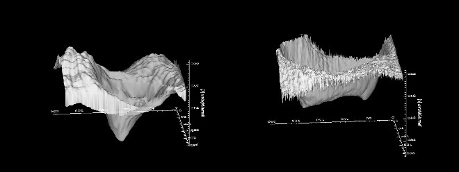 Eje vertical: temperatura. Plano horizontal: la superficie del polo Sur. Izquierda: Ahora, Derecha: Como era justo cuando llegó la nave en 2006 (se aprecia el parecido a un doble vórtice, que ahora se ha perdido).