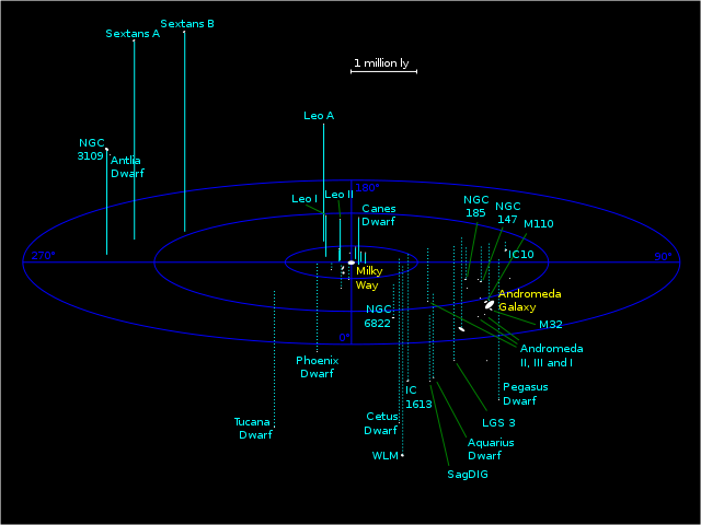 Como todos sabéis, nosotros estamos en un extremo del brazo espiral de nuestra Galaxia, la Vía Láctea, junto a otros 300.000 millones de soles, en un espacio de unos 100.000 años-luz de lado a lado. En el siguiente nivel jerárquico, «nosotros» (la Vía Láctea, se entiende) estamos en un «ramillete» o «agrupación» de galaxias que se llama poco imaginativamente el Grupo Local. Este comité de galaxias son nuestros compañeros de viaje a la deriva por los inmensos vacíos inter-grupos, formando un «apretado grupo» de unas treinta galaxias en un espacio de nada más y nada menos que 10 millones de años luz.