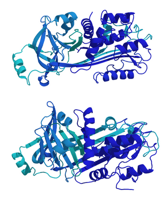 Volviendo a la representación 3D de la proteína arriba, cada una de esas espirales (hélices α) o bandas (β láminas) son lo que se llaman estructuras secundarias de la proteína (la primaria es la cadena covalente de péptidos). Para que esa secuencia de hélices y láminas tome su forma «natural», la que la proteína debe tener por ser esa la razón misma de su existencia, se llega a lo que se llama estructura terciaria.