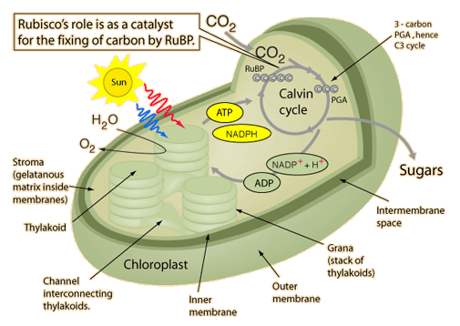 La RuBisCo cataliza, más rápido para mayores intensidades de luz solar, la incorporación de CO2 a una molécula de ribulosa-1,5-bisfosfato (RuBP), dando lugar a otra molécula que no nos interesa pero que finalmente acaba siendo transformada en glucosa. Ese es el origen de la mayor fuente de energía de todos los animales, y es generada por las plantas a partir de luz solar y CO2.