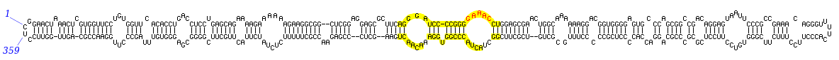 Eso es todo: 359 nucleótidos de RNA que forman una doble cadena consigo mismo, ni siquiera de manera perfecta (fíjate cómo en algunas partes la cadena no está «pegada» ya que las bases de cada lado no son las complementarias).