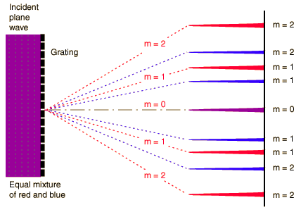 La distancia entre agujeros debe ser del orden de magnitud de la longitud de onda de la luz que se quiere analizar y lo que se consigue es separar la luz en sus distintos colores de una forma mucho más eficiente a como lo haría un prisma. Para detectar la separación habrá que mirar el patrón desde un ángulo que coincida con los puntos señalados como «m=1» en el dibujo.