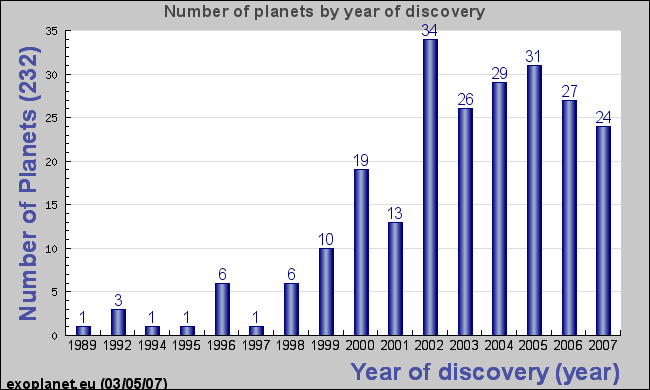 | Hasta 2007 se conocían 232 exoplanetas (Fuente) |