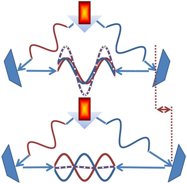 | Ejemplo de interferómetro óptico. Arriba y abajo se ven casos de interferencia constructiva y destructiva, respectivamente. (fuente) |