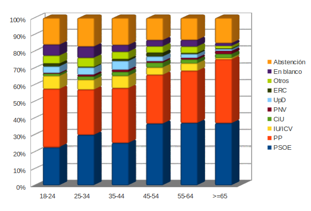 Por «petición popular» y dado el éxito del anterior post, he ampliado el análisis de la intención de voto de las últimas Generales clasificando ahora por edad y por profesión de los votantes.