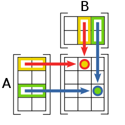 Cada elemento (i,j) de la matriz resultante proviene de sumar el producto (escalar a escalar) de una fila de A con una columna de B. Si todas las matrices son de NxN, esto implica  (O(N) ) operaciones, por cada una de las  (N times N=N^2) entradas de la matriz producto, nos da el obvio  (O(N^3)).