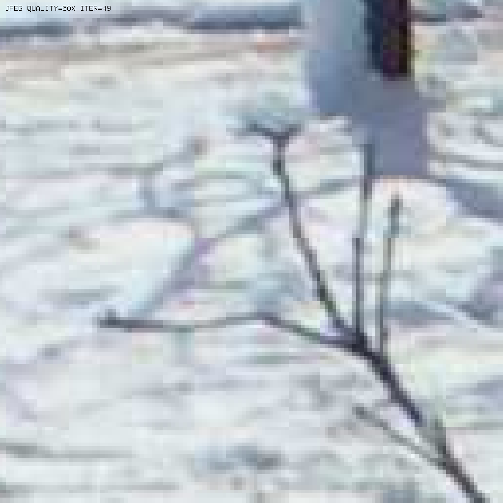 Y ya para poner las cosas extremadamente difícil a JPEG, he repetido el mismo experimento pero ahora desplazando la imagen 1 píxel hacia la derecha en cada re-codificación. Veamos el vídeo (recomiendo poner el vídeo a la máxima resolución):
