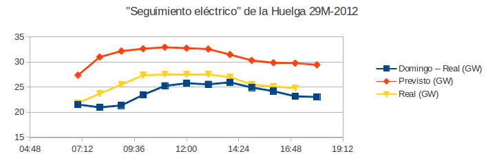 Anoche vimos cómo Red Eléctrica de España (REE) cambió su predicción de consumo para hoy como si fuese a ser un domingo (bajada del ~30%). El ajuste se va adaptando hora a hora, y a las 10:00 indica una caída similar a la anterior huelga de septiembre de 2010 (ver tabla más abajo). No somos los únicos en proponer medir el consumo para monitorizar la huelga por cierto: Politikon.