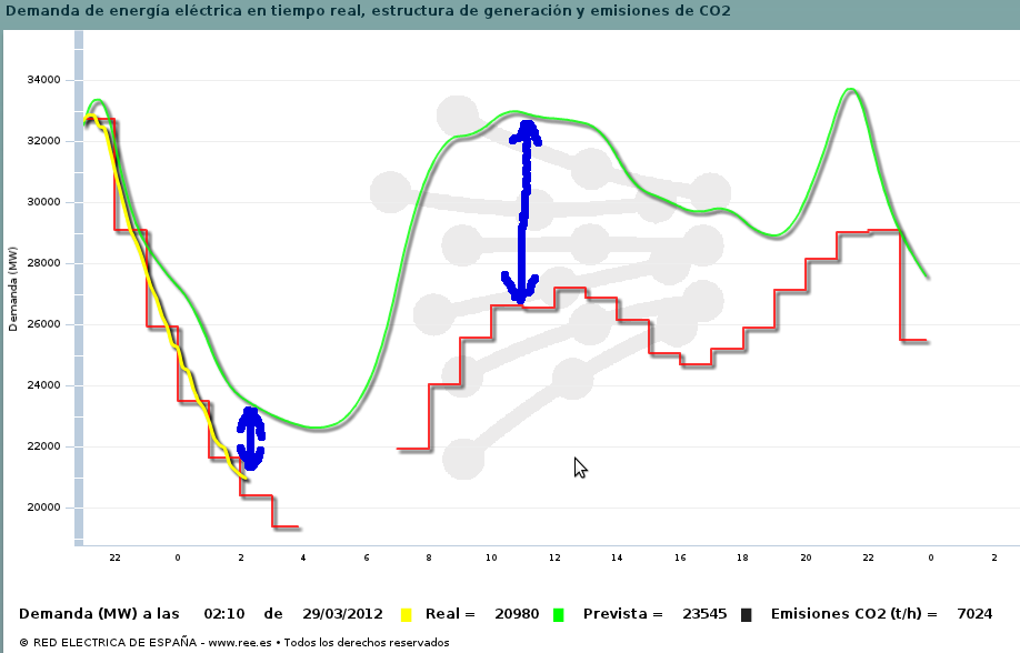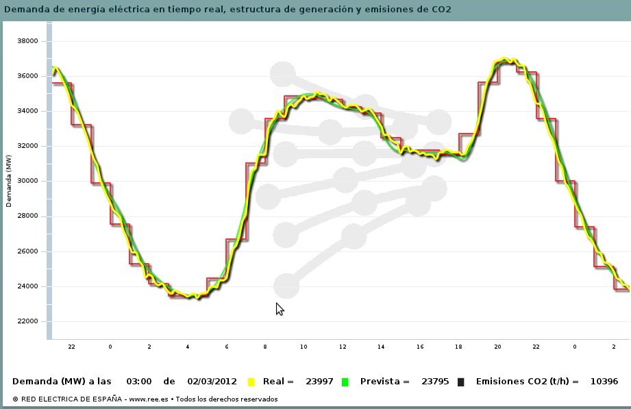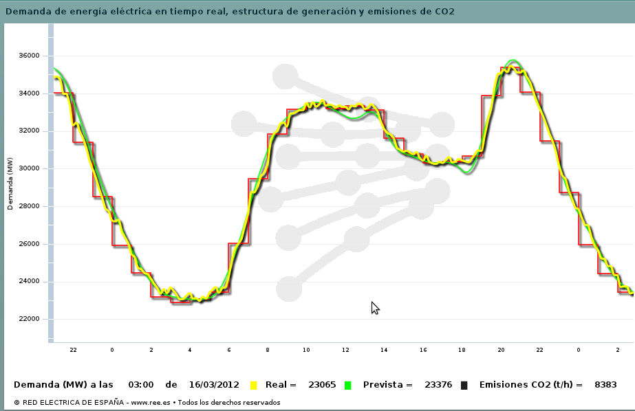 ¿A qué porcentaje de seguimiento equivaldría un 30% en bajada de consumo? Es algo difícil de valorar, pero mirando datos históricos la predicción de REE coincide con un día típico de domingo. Por ejemplo, el domingo pasado se gastaban 25GW a media mañana, exactamente lo programado para mañana.