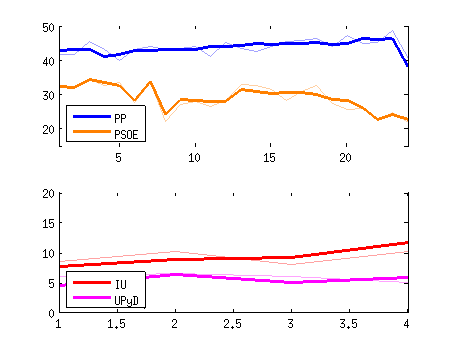 Viendo las gráficas, también podríamos decir, por ejemplo, que el PP no ha parado de subir desde enero de 2011 (43,1%) hasta enero de 2012 (46,4%).