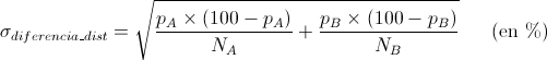 Para casos como este en que comparamos porcentajes de apoyo a distintas opciones A y B, dentro de una misma encuesta, se demuestra que la desviación estándar de la ventaja entre A y B, dando los porcentajes p_A y P_B en tanto por ciento, es: