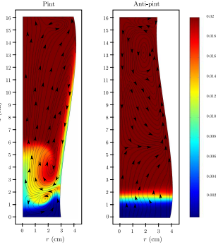 Con todos esos parámetros, sus simulaciones les han revelado que solamente aparecerán burbujas hundiéndose cuando el vaso tenga la «típica» forma de las pintas, más ancha arriba que abajo. Como contraejemplo han simulado una «anti-pinta» (esto ya se aproxima demasiado al Ig-Nobel) y han verificado que ahí las burbujas solamente subirían.