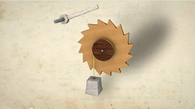 Texto de Leonardo: «Los constructores usan un mecanismo llamado «ritenáculo»entre los florentinos, cuya forma corresponde a una rueda dentada en ángulos rectos, como la que se ve aquí arriba. La única función de este mecanismo es la de no dejar que se deslice o que vuelva hacia atrás una cosa en movimiento. En las máquinas para levantar pesos, este dispositivo proporciona una gran seguridad. La pieza que apoya sobre los dientes de la rueda se llama servidor, porque obedece y sirve a la rueda. El servidor debe formar un ángulo recto con la línea del diente de la rueda, y esta línea debe estar dirigida hacia el centro de la rueda. Se acostumbra colocar el servidor en línea horizontal para que pese sobre el sitio en el cual se apoya. La línea del diente de la rueda debe estar en perfecto contacto con la del servidor. Y esto es lo que confiere al mecanismo su mayor grado de perfección y de calidad».