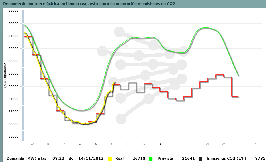 Adjunto los datos, que se irán actualizando a lo largo del día. Incluyen el consumo real del último domingo (11 de noviembre) como referencia de un día de actividad mínima, la predicción de consumo para el día de hoy (como si fuera un día laboral normal) y el consumo real en tiempo real.
