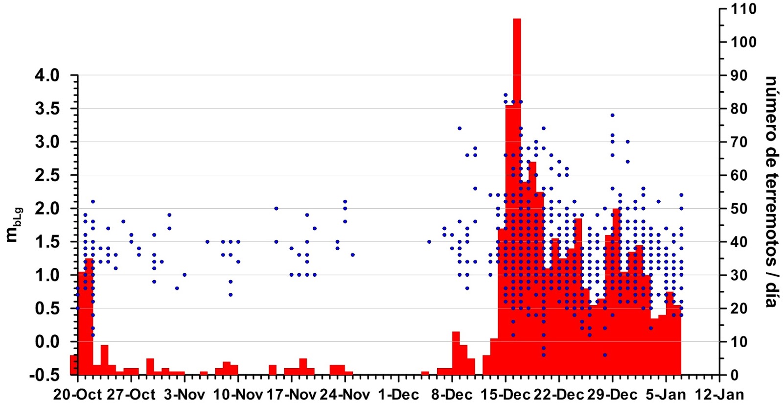 | Los 1164 sismos registrados entre el 20 de octubre de 2012 y el 7 de enero de 2013 (Fuente: IGN) |