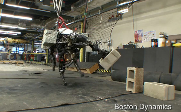 El bloque de hormigón que levanta como si no fuera nada pesa unos 23 kg. Lo más interesante de las técnicas que esta empresa está desarrollando es la sincronización del brazo con el resto del cuerpo, para aprovechar la inercia de todo el cuerpo a la hora de efectuar un movimiento brusco que de otra forma requeriría motores aún más potentes. Es algo natural en todos los animales y en las personas, pero difícil de conseguir en un robot.