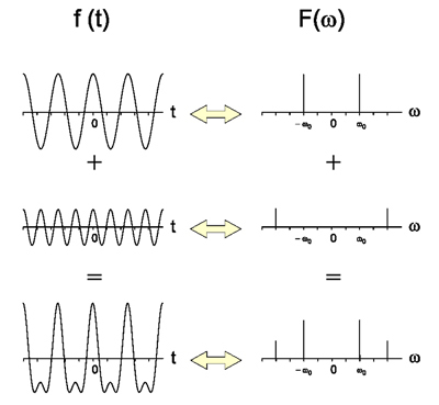 Usando la transformada de Fourier se demuestra que cada tono puro (una señal senoidal) aparece como dos picos de frecuencia, una en la frecuencia correspondiente al tono y otro pico en el valor de frecuencia negativa: