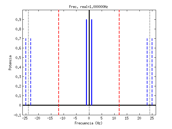 Las líneas rojas discontinuas están colocadas en 12Hz (la máxima frecuencia muestreable sin ambigüedad) y en 24Hz (la frecuencia de muestreo).