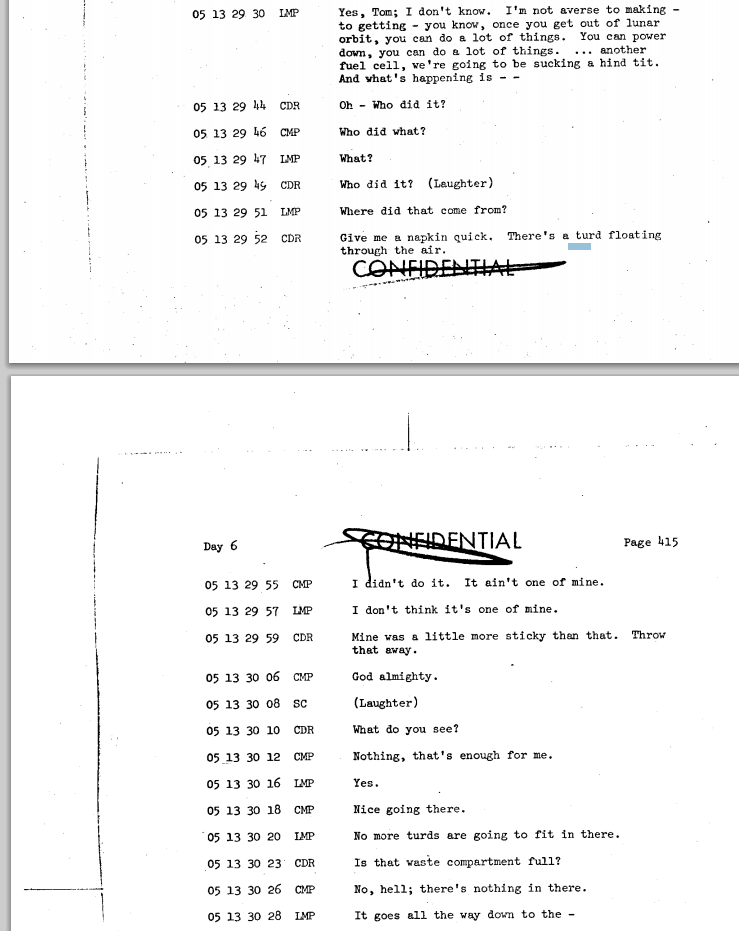 Unos meses antes de que el Apolo 11 hiciera historia llevando a Neil Armstrong a la Luna, el Apolo 10 consiguió llevar a otros tres astronautas a la órbita lunar. Éxitos aparte, la transcripción de las conversaciones entre la nave y tierra (PDF) revela que los hombres tuvieron algún que otro… problemilla escatológico a bordo.