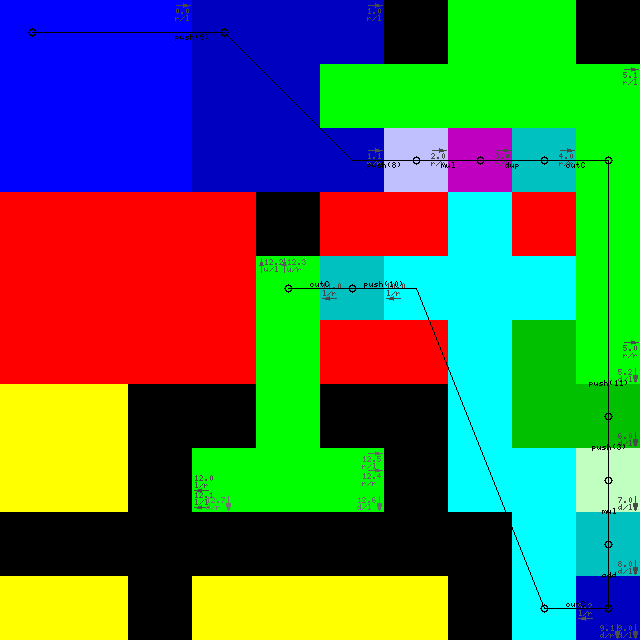 Una forma curiosa de enviar mensajes sencillos «codificados» en una imagen, aunque desde luego no serán tan discretas como otras técnicas avanzadas de estenografía. Existe un editor/programa de dibujo y un intérprete llamado npiet.